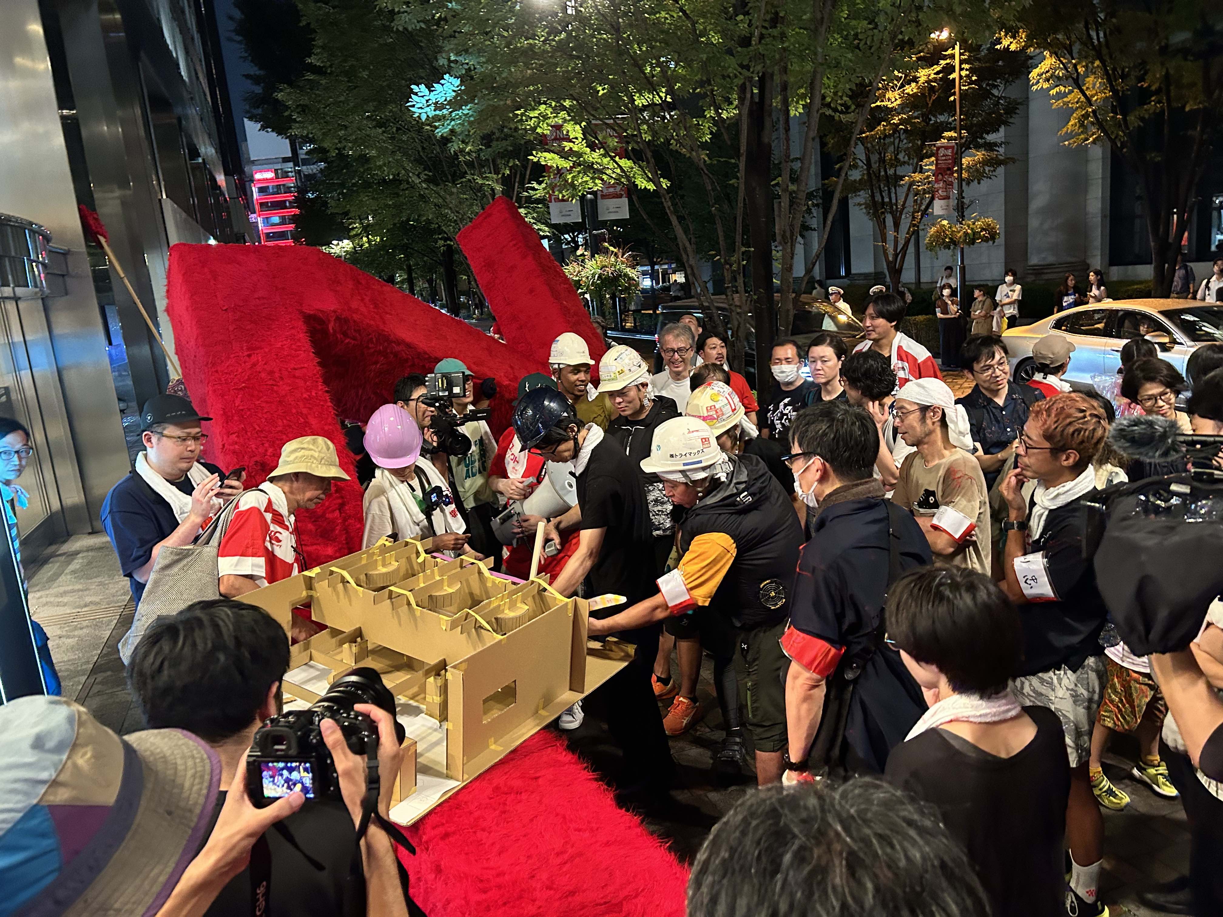 建物にぎりぎり入るサイズの物体を設計・制作し、その物体をみんなで力を合わせて運び込む、