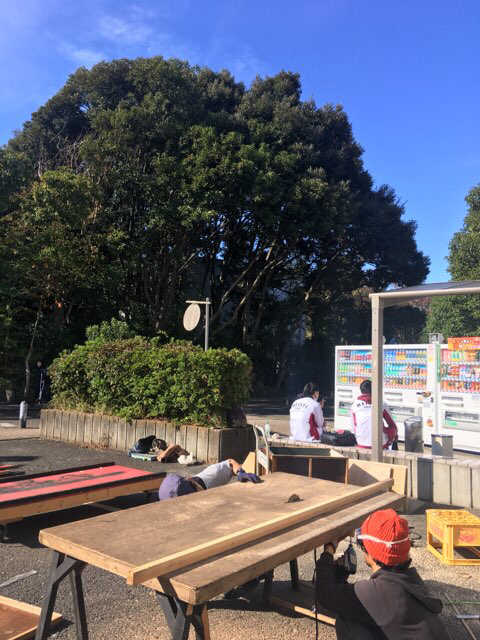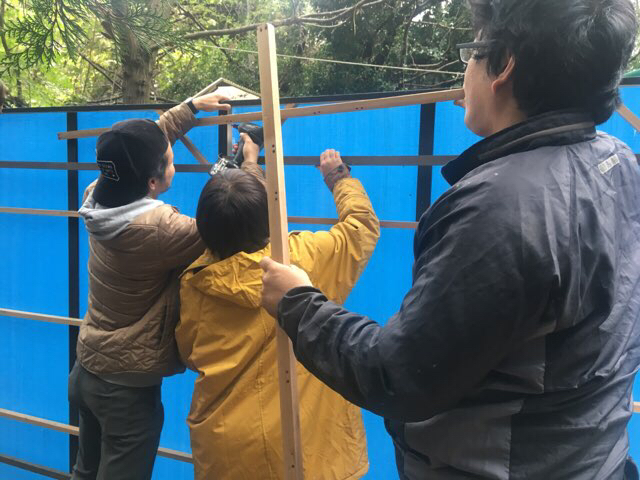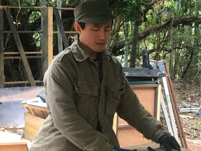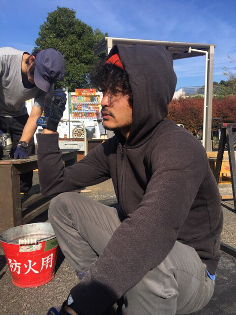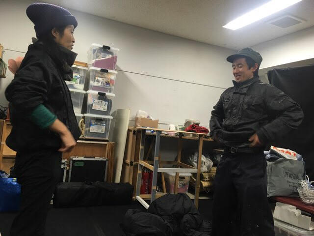 思いのほか渋い顔をして作業していた重村大介。寒さにめっぽう弱いのでめちゃくちゃ着込んでます。
