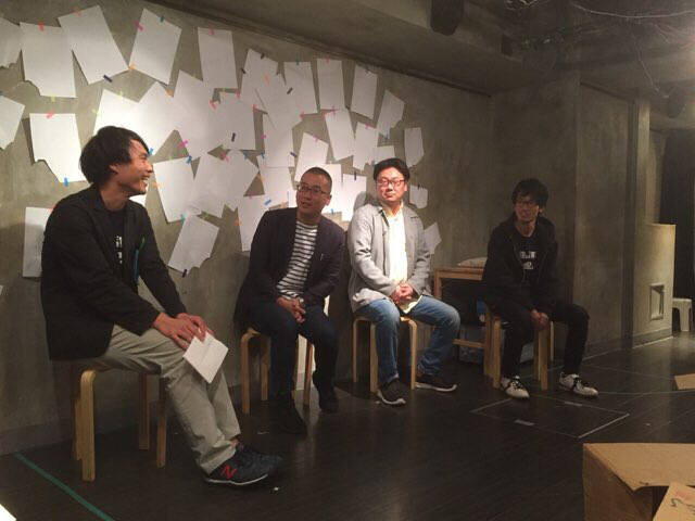 (主宰・演出の松本一歩さん、中野、今回の演目の作者・武重守彦(めがね堂)さん、俳優の鈴木大倫さん)
