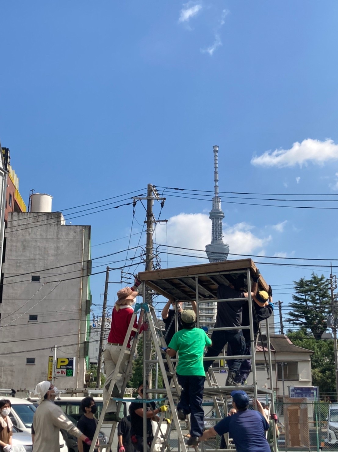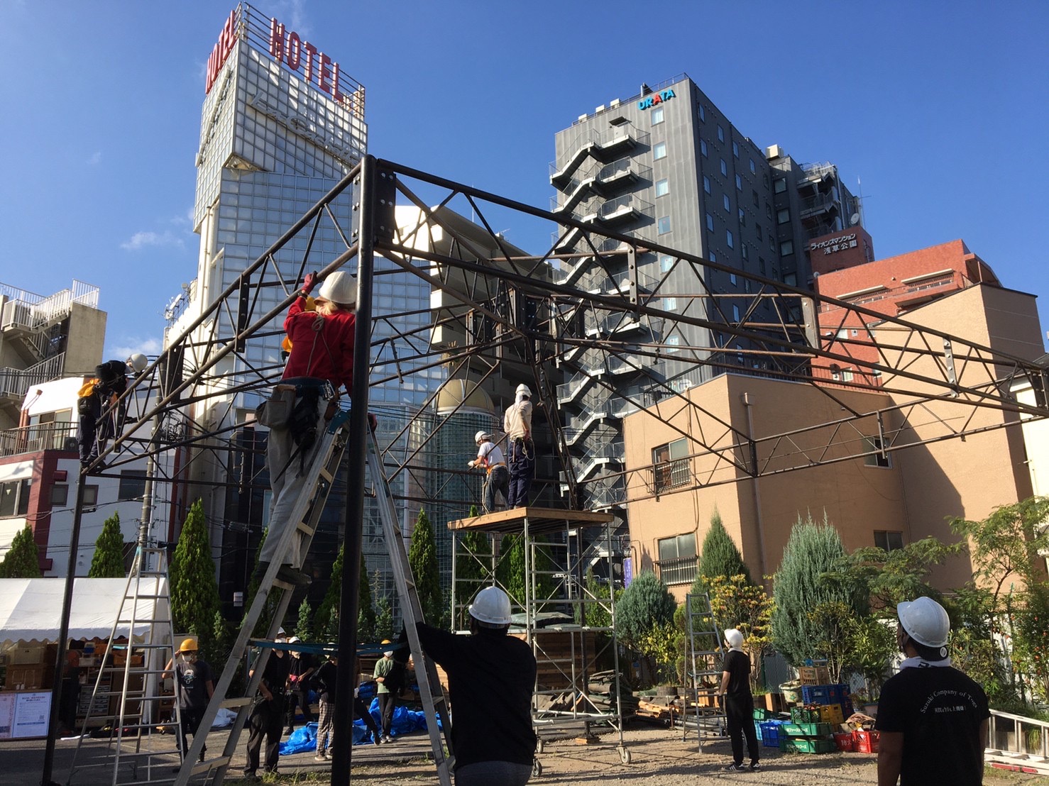 午後になり、さらに強さを増す日差しの中で鉄骨を組み合わせ、