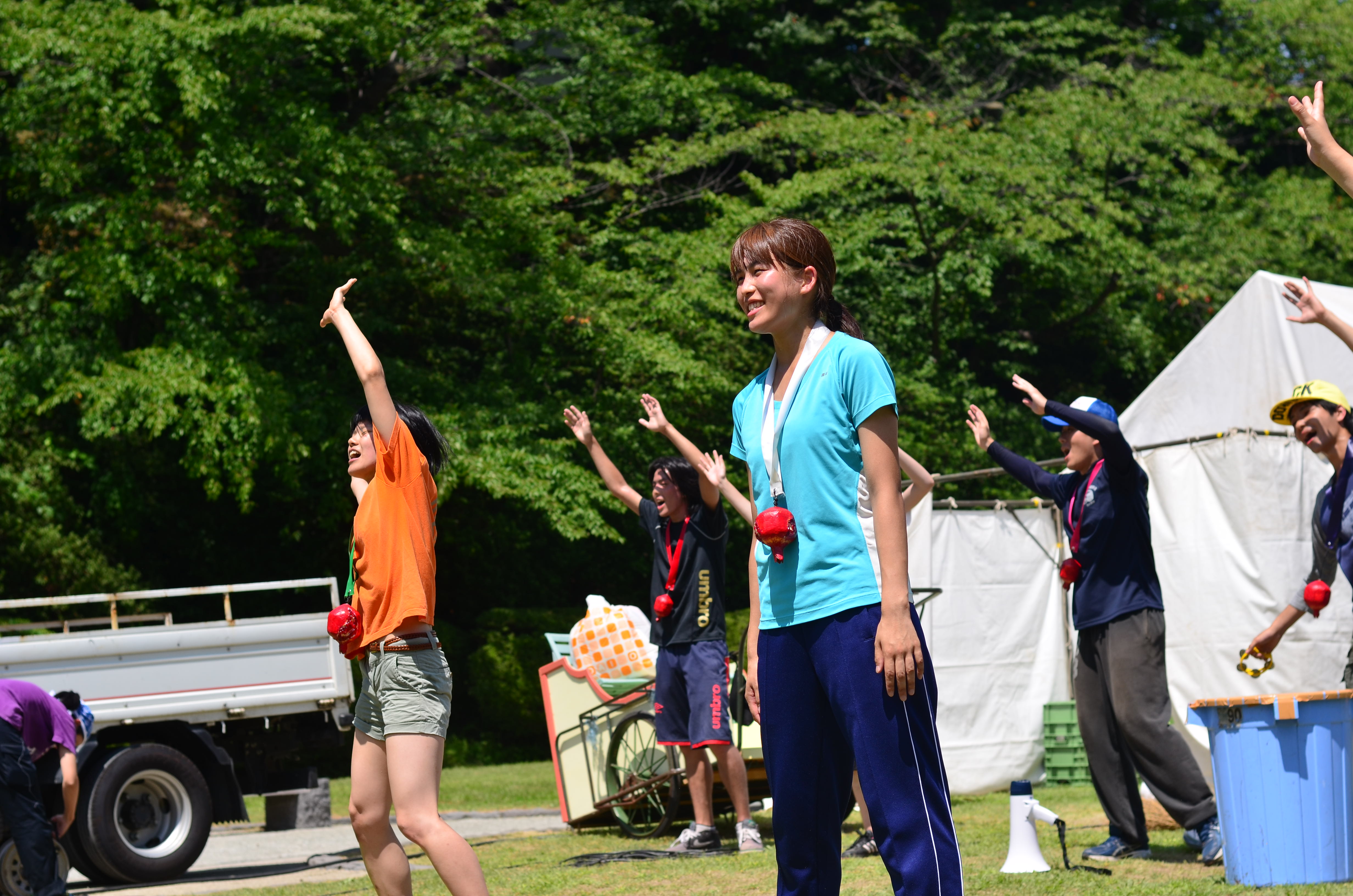 臨港パークで荷物を送り出す班と、大学でそれを受け取り、片付けをする班。